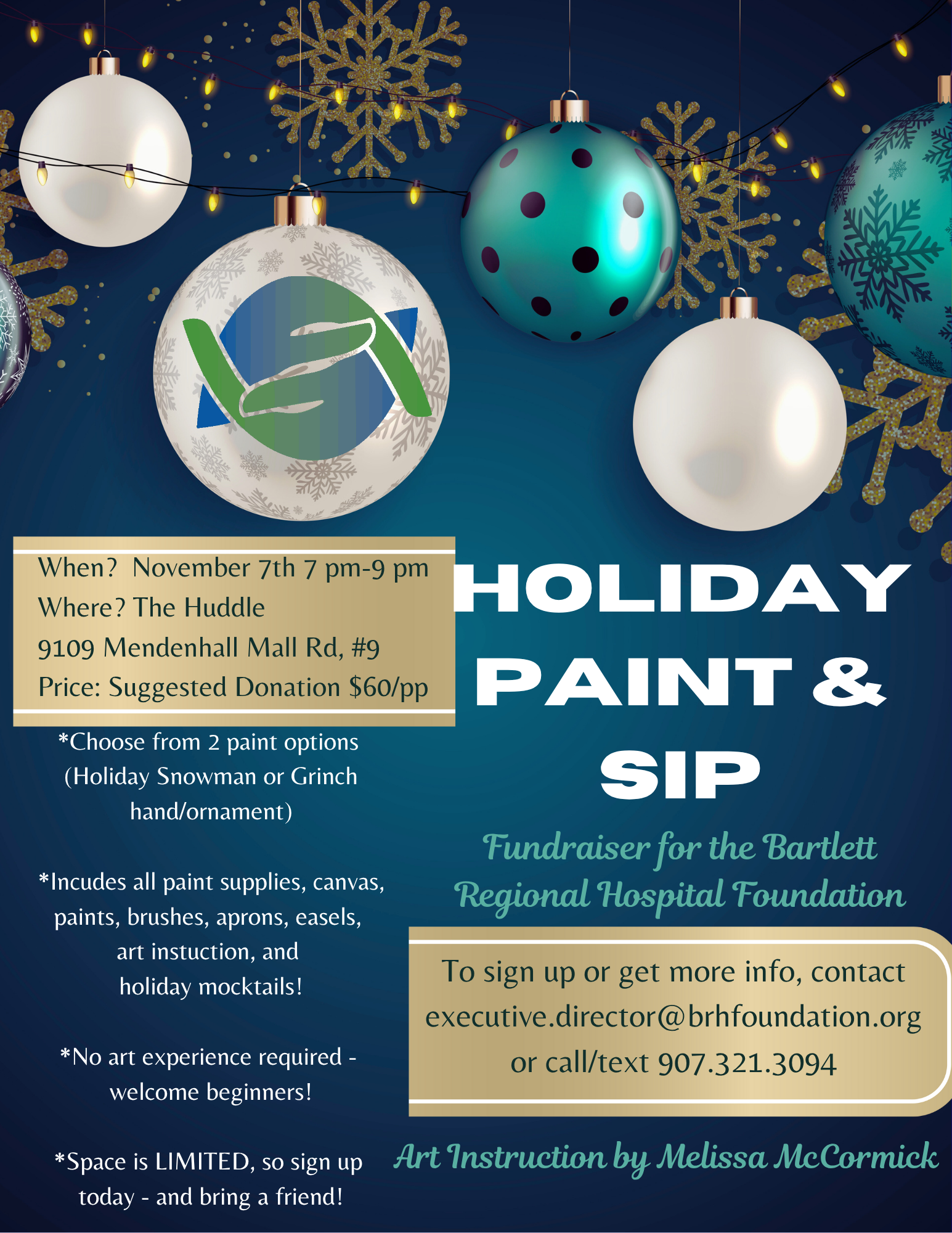 Join us on Friday, November 7th from 7 pm to 9 pm for our Holiday Paint & Sip Fundraiser at the Huddle!